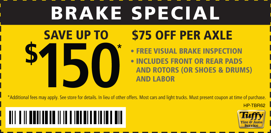 Good only atTuffy N. Clermont Expires 01/15/26 Schedule Service Print coupon Share to Google Share to Facebook Share to Yelp Offer details Brake Special Save up to $150 $75 OFF Per Axle * See coupon for exclusions. Email Coupon First name * Last name * Email address * Sign me up to receive future offers via text from Tuffy North Clermont Hwy 50: Via Text Cell/Mobile Phone By clicking "I accept" below, I expressly agree to receive marketing text messages made by or on behalf of Tuffy North Clermont Hwy 50 to the telephone number(s) I’ve listed above. I understand that I may receive such text messages by the use of Automatic Telephone Dialing Systems (including “Predictive Dialers” or “Autodialers”) and I agree to receive them even if I have registered my number(s) with my state or federal Do-Not-Call list(s). I understand that such text messages will include advertising containing offers for goods or services and that I may revoke this consent at any time by telephone, return text message or by Visiting tuffynorthclermont.com/stop to unsubscribe. Message and data rates may apply. I also understand that I am NOT required to provide this consent as a condition of purchasing goods or services. I accept View: Text Specials Terms and Conditions with this link.