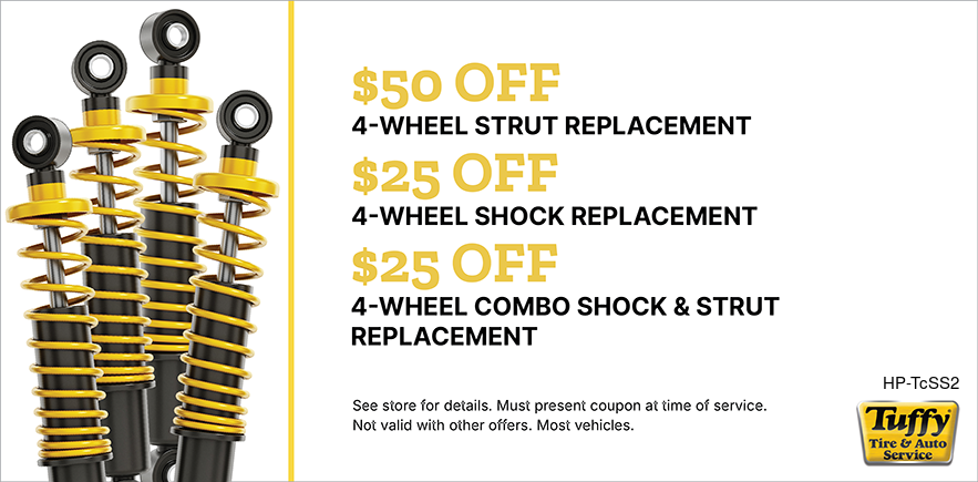 Good only atTuffy N. Clermont Expires 04/15/26 Schedule Service Print coupon Share to Google Share to Facebook Share to Yelp Offer details $50/$25/$25 OFF Struts and Shocks * See coupon for exclusions. Email Coupon First name * Last name * Email address * Sign me up to receive future offers via text from Tuffy Clermont Hwy 50: Via Text Cell/Mobile Phone By clicking "I accept" below, I expressly agree to receive marketing text messages made by or on behalf of Tuffy Clermont Hwy 50 to the telephone number(s) I’ve listed above. I understand that I may receive such text messages by the use of Automatic Telephone Dialing Systems (including “Predictive Dialers” or “Autodialers”) and I agree to receive them even if I have registered my number(s) with my state or federal Do-Not-Call list(s). I understand that such text messages will include advertising containing offers for goods or services and that I may revoke this consent at any time by telephone, return text message or by Visiting tuffynorthclermont.com/stop to unsubscribe. Message and data rates may apply. I also understand that I am NOT required to provide this consent as a condition of purchasing goods or services. I accept View: Text Specials Terms and Conditions with this link.